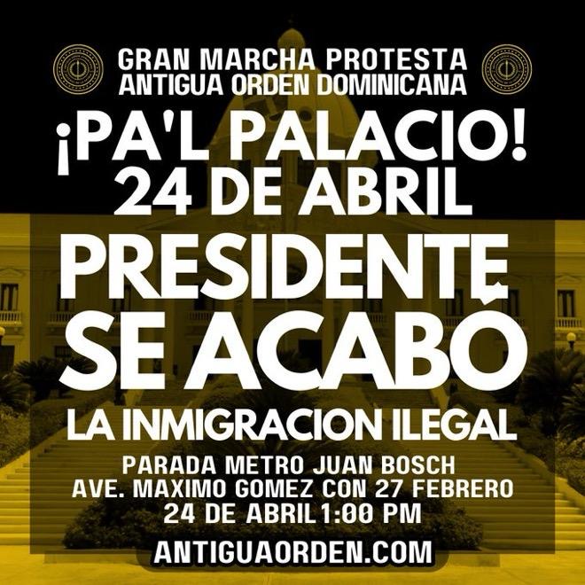 Santo Domingo, RD.- Argumentando que el pueblo dominicano no resiste más ilegales haitianos en su territorio y acusando al gobierno de la República Dominicana que preside Luis Abinader de ser indiferente ante el desborde de migrantes indocumentados, la Antigua Orden convocó una marcha protesta hacia el Palacio Nacional para el próximo día 24 de abril.
