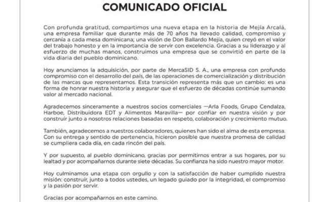 Este lunes, el Grupo MercaSID, S.A. anunció la adquisición de las marcas internacionales que anteriormente comercializaba Mejía Arcalá, S.R.L., incluyendo productos de alto consumo en el país como Milex y Del Monte, en todas sus variedades.