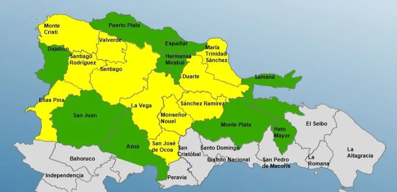 Las provincias en alerta amarilla, que podrían experimentar lluvias intensas y otras condiciones meteorológicas adversas, son: Samaná, Santiago Rodríguez, Hato Mayor, María Trinidad Sánchez, Monseñor Nouel, Sánchez Ramírez, El Seibo, La Vega, Hermanas Mirabal, Santiago y Espaillat.