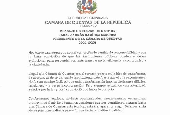 Santo Domingo, RD.- En un mensaje al entregar la presidencia de la Cámara de Cuentas, Janel Ramírez asegura que mantendrá su apuesta por una República Dominicana en la que la integridad, la transparencia y la institucionalidad sean pilares, no discursos.