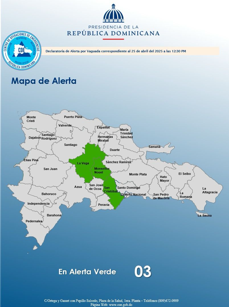 En virtud de estas condiciones y conforme a lo establecido en el artículo 2, capítulo 1 de la Ley 147-02 sobre Gestión de Riesgos, el COE ha declarado nivel de alerta verde por posibles crecidas de ríos, arroyos y cañadas, así como inundaciones repentinas o urbanas en las provincias mencionadas.