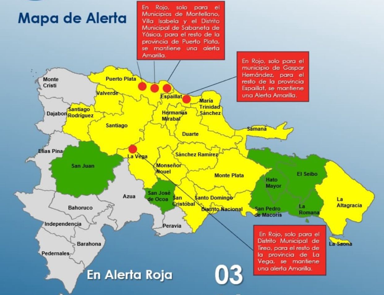 En alerta roja está el municipio de Gaspar Hernández, (para el resto de la provincia Espaillat, se mantiene una alerta amarilla), el municipio Montellano, Villa Isabela y Distrito Municipal de Sabaneta de Yásica, (para el resto de la provincia de Puerto Plata, se mantiene una alerta amarilla), el Distrito Municipal de Tireo, (para el resto de la provincia de La Vega, se mantiene una alerta amarilla).