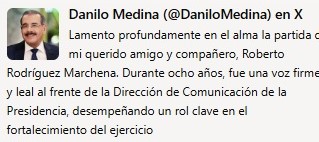 Santo Domingo, RD.- El expresidente Danilo Medina lamentó el fallecimiento de Roberto Rodríguez Marchena, exvocero del Gobierno y miembro del Comité Político del Partido de la Liberación Dominicana (PLD), debido a un paro cardíaco en su residencia.