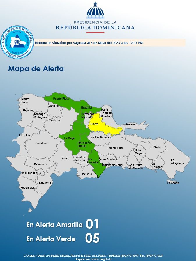 Santo Domingo, 8 de mayo de 2025 – El Centro de Operaciones de Emergencias (COE) informó este jueves que mantiene una provincia en Alerta Amarilla y cinco en Alerta Verde, debido al riesgo de inundaciones repentinas urbanas y rurales, crecidas de ríos, arroyos y cañadas, así como deslizamientos de tierra.