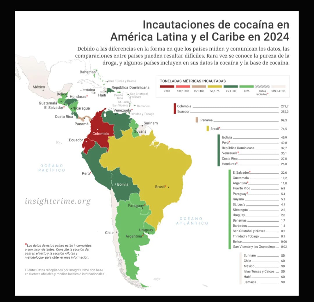 Las autoridades colombianas incautaron 279,7 toneladas de cocaína dentro del territorio nacional y en aguas internacionales en 2024. Aunque esto representa una disminución del 11,2% en comparación con las 335,4 toneladas de 2023, la cooperación internacional condujo a un aumento del 18,4% en la cocaína incautada junto con otros países, pasando de 746,3 a 883,8 toneladas.