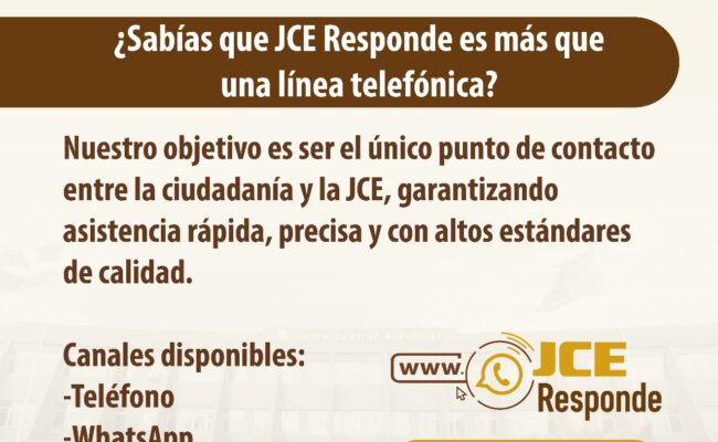Santo Domingo. – La Junta Central Electoral (JCE), como institución responsable de administrar y custodiar la identidad de los dominicanos y de los extranjeros residentes en el país, pone a disposición de la ciudadanía el “Centro de Contacto Institucional JCE Responde” con el objetivo de seguir fortaleciendo, optimizando y agilizando los diferentes servicios que ofrecemos.