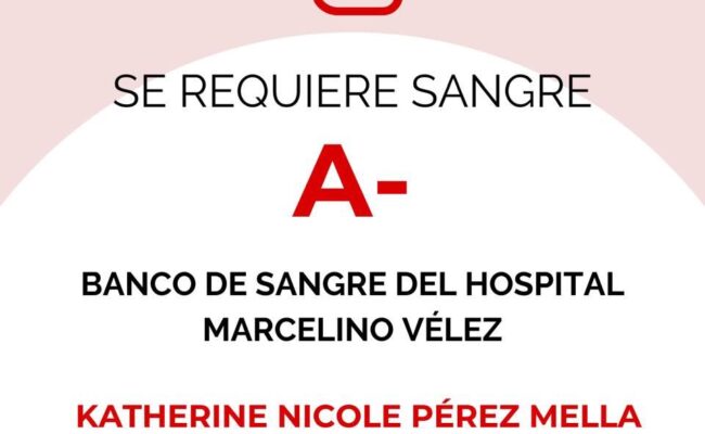 Se requiere con carácter de emergencia la donación de sangre A- en el Banco de Sangre del Hospital Doctor Marcelino Vélez Santana en Herrera, Santo Domingo Oeste, para Katherine Nicole Pérez Mella, quien se encuentra en estado delicado.