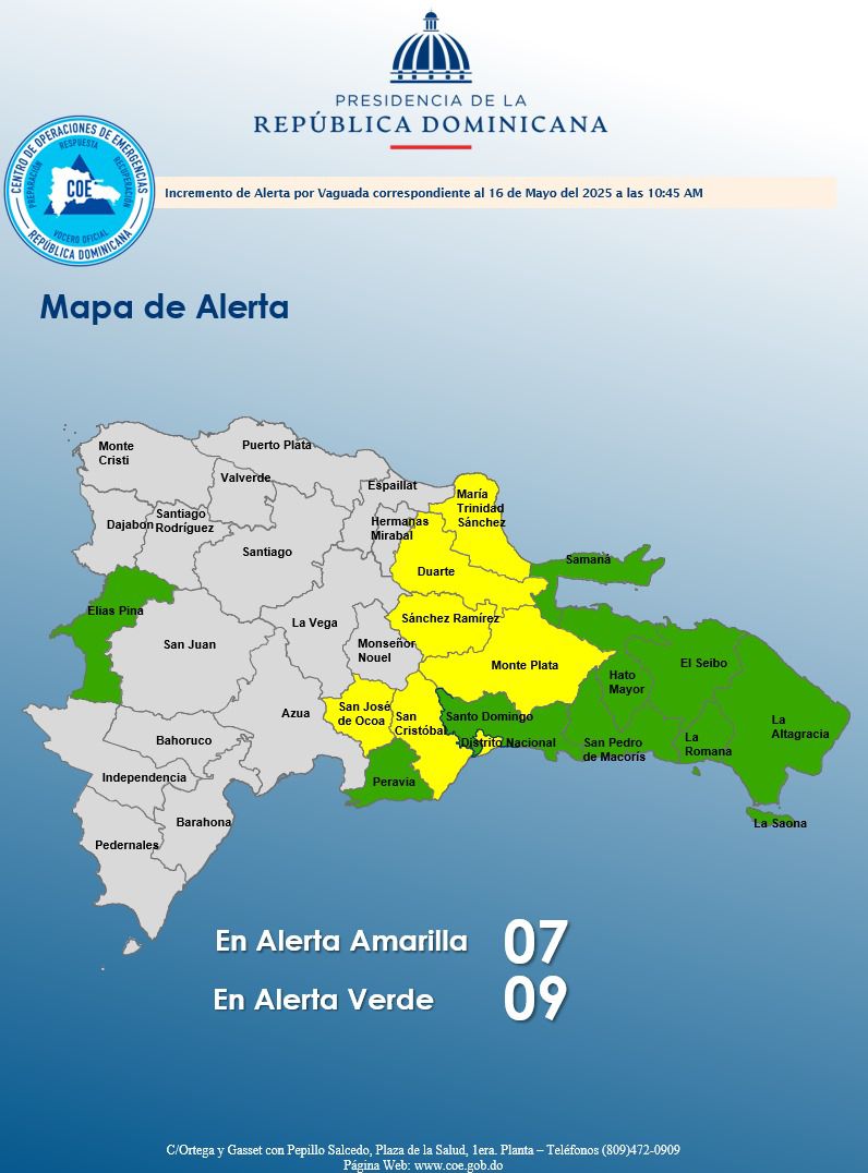 Santo Domingo, — El Centro de Operaciones de Emergencias (COE) informó este viernes que siete (7) provincias continúan bajo alerta amarilla y nueve (9) en alerta verde, debido a la persistencia de condiciones meteorológicas que podrían generar inundaciones repentinas urbanas y rurales, crecidas de ríos, arroyos y cañadas, así como deslizamientos de tierra.