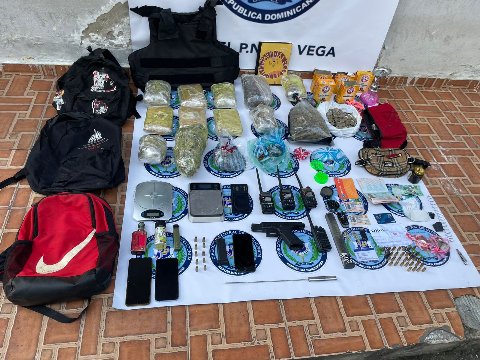 Se le incautaron 15 porciones de presunta marihuana, clasificadas en distintos tamaños y empaques, así como tres balanzas, un cargador para pistola con 10 balas, tres radios de comunicación, dos dispositivos tipo vape, un chaleco antibalas, una hookah, cinco cajas de bicarbonato de sodio, un punzón, una lanza de fabricación casera, tres teléfonos celulares y RD$4,385.00 en monedas.