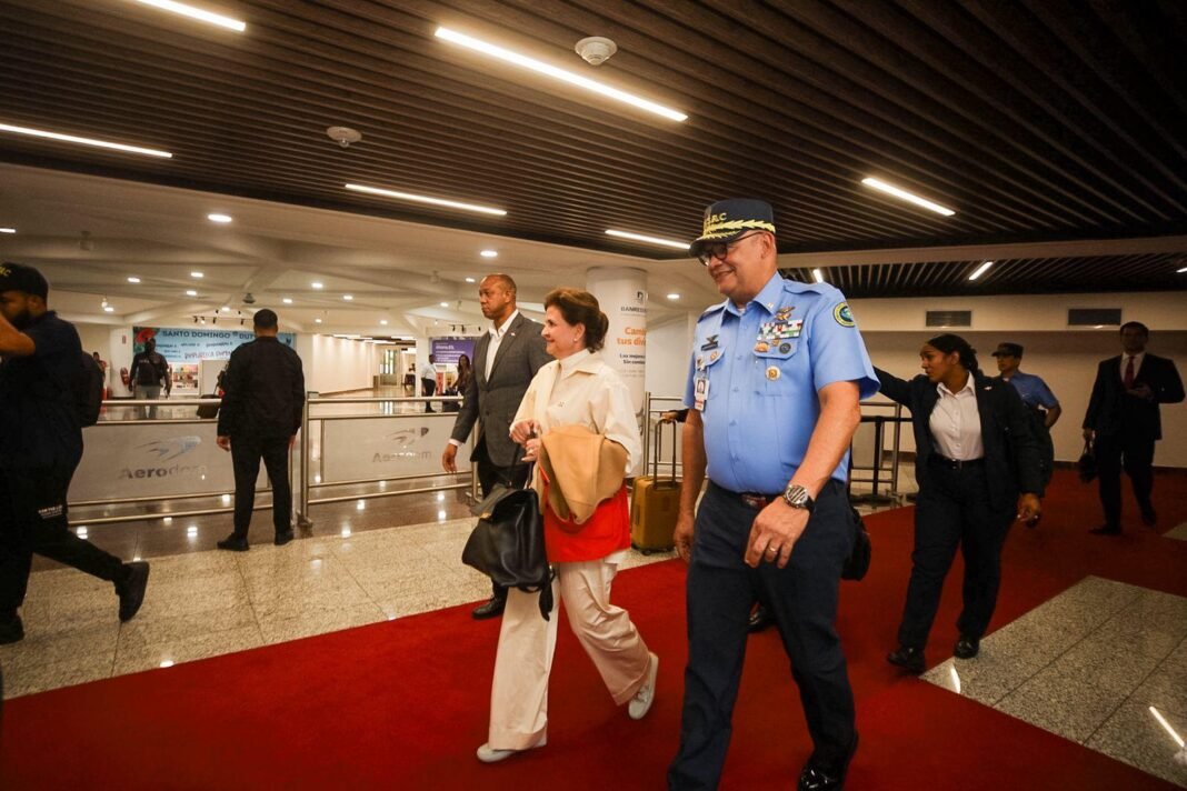 Peña arribó a Santo Domingo pasadas las 6:00 de la tarde, por el Aeropuerto Internacional de Las Américas Dr. José Francisco Peña Gómez y fue recibida por el general de brigada piloto Enmanuel Souffront Tamayo, FARD, director del Cuerpo Especializado en Seguridad Aeroportuaria y de la Aviación Civil (CESAC).