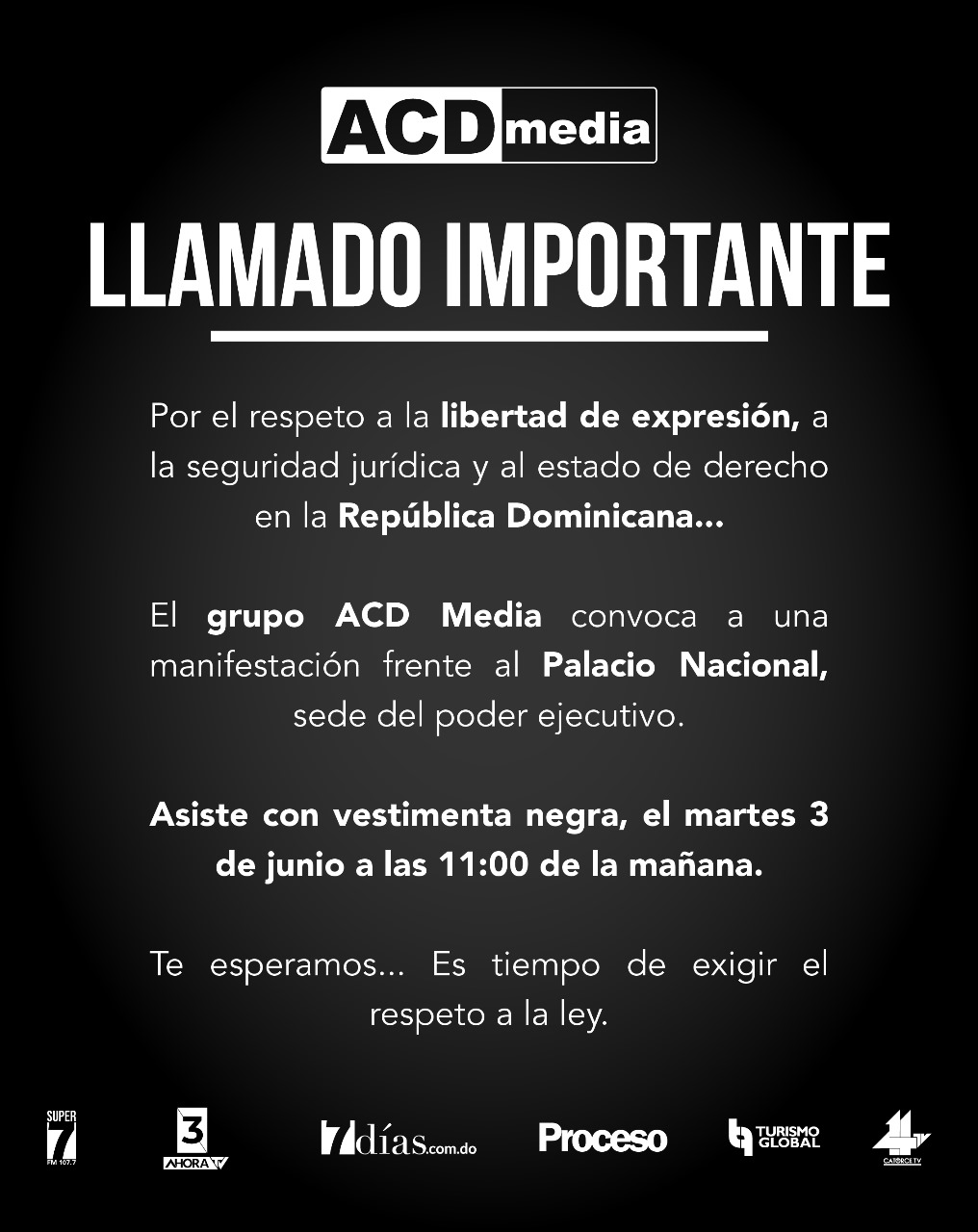 Ratificó la convocatoria de una manifestación para el martes 3 de junio frente al Palacio Nacional debido a una reciente posición asumida por el Instituto Dominicano de las Telecomunicaciones (Indotel) respecto al manejo de la frecuencia del canal 3. La actividad está programada para las once de la mañana de ese día.