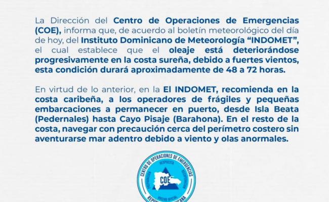 Santo Domingo, R.D. – La Dirección del Centro de Operaciones de Emergencias (COE) emitió la noche este sábado una alerta preventiva tras el más reciente boletín meteorológico del Instituto Dominicano de Meteorología (Indomet), en el que se advierte sobre un progresivo deterioro del oleaje en la costa sur del país, provocado por fuertes vientos.