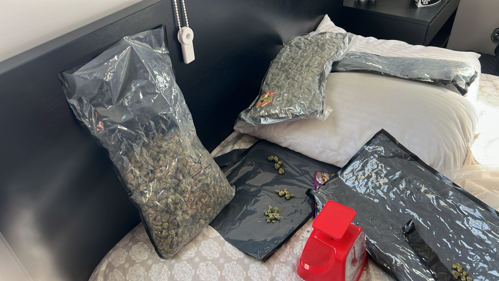 Al incursionar en la vivienda, se localizaron cinco maletas en las habitaciones, en cuyo interior se ocuparon un total de 60 paquetes del vegetal, que se presume es marihuana, todos envueltos en fundas plásticas de color negro, con un peso preliminar de (61.1 libras, equivalente a 29,982 gramos).