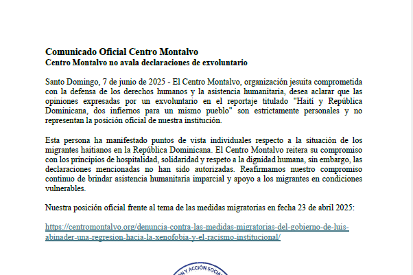 Santo Domingo,. – El Centro Montalvo, organización jesuita dedicada a la defensa de los derechos humanos y la asistencia humanitaria, aclaró que no respalda las afirmaciones publicadas recientemente por Vatican News, medio oficial de la Santa Sede, en un reportaje que denuncia supuestas violaciones sistemáticas de derechos humanos contra más de un millón de refugiados haitianos en República Dominicana.