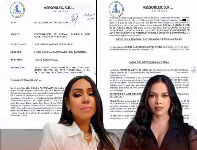 La querella solicita una indemnización de RD$35 millones por daños morales y materiales. Además, se pide acceso a posibles pruebas digitales, incluso si fueron eliminadas de las plataformas. Ingrid Jorge ya fue notificada oficialmente del proceso legal.