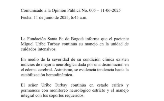“En medio de la gravedad de su condición clínica, existen indicios de mejoría neurológica, evidenciados por una disminución del edema cerebral. Asimismo, se observa una tendencia hacia la estabilización hemodinámica”, se especifica en la comunicación firmada por Adolfo Llinás Volpe, director de la Fundación.