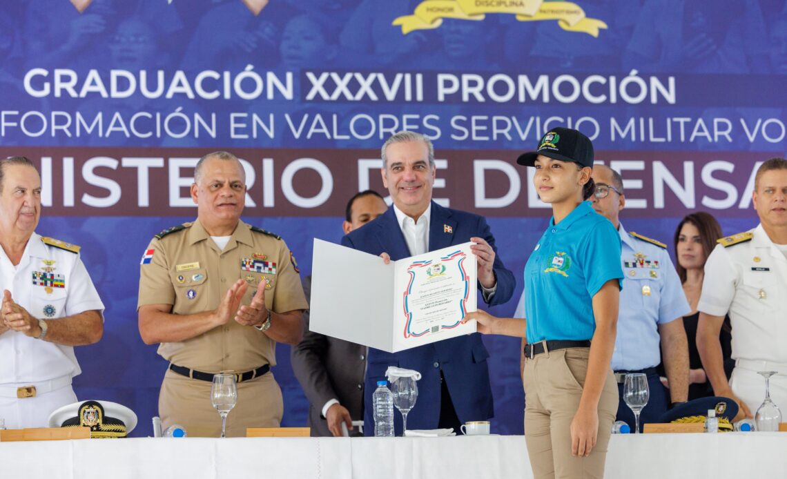 El presidente Luis Abinader encabezó este martes la ceremonia de graduación y tomó el juramento de 5,536 jóvenes pertenecientes a la Trigésima Séptima Promoción del Programa Formación en Valores del Servicio Militar Voluntario (SMV), una iniciativa orientada a fortalecer la educación en valores y la disciplina cívico-militar de la juventud dominicana.