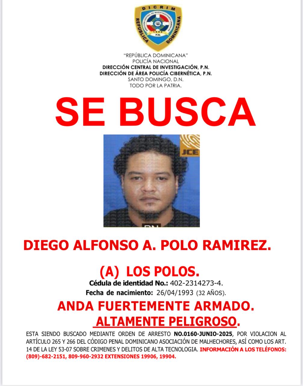 El tercero, Winal Freddy Polo Peralta, también conocido como "Los Polos", de 29 años, es buscado mediante la orden de arresto No. 0159-junio-2025, por los mismos cargos de asociación de malhechores y delitos de alta tecnología. Al igual que los otros implicados, se advierte que está fuertemente armado y es considerado altamente peligroso.