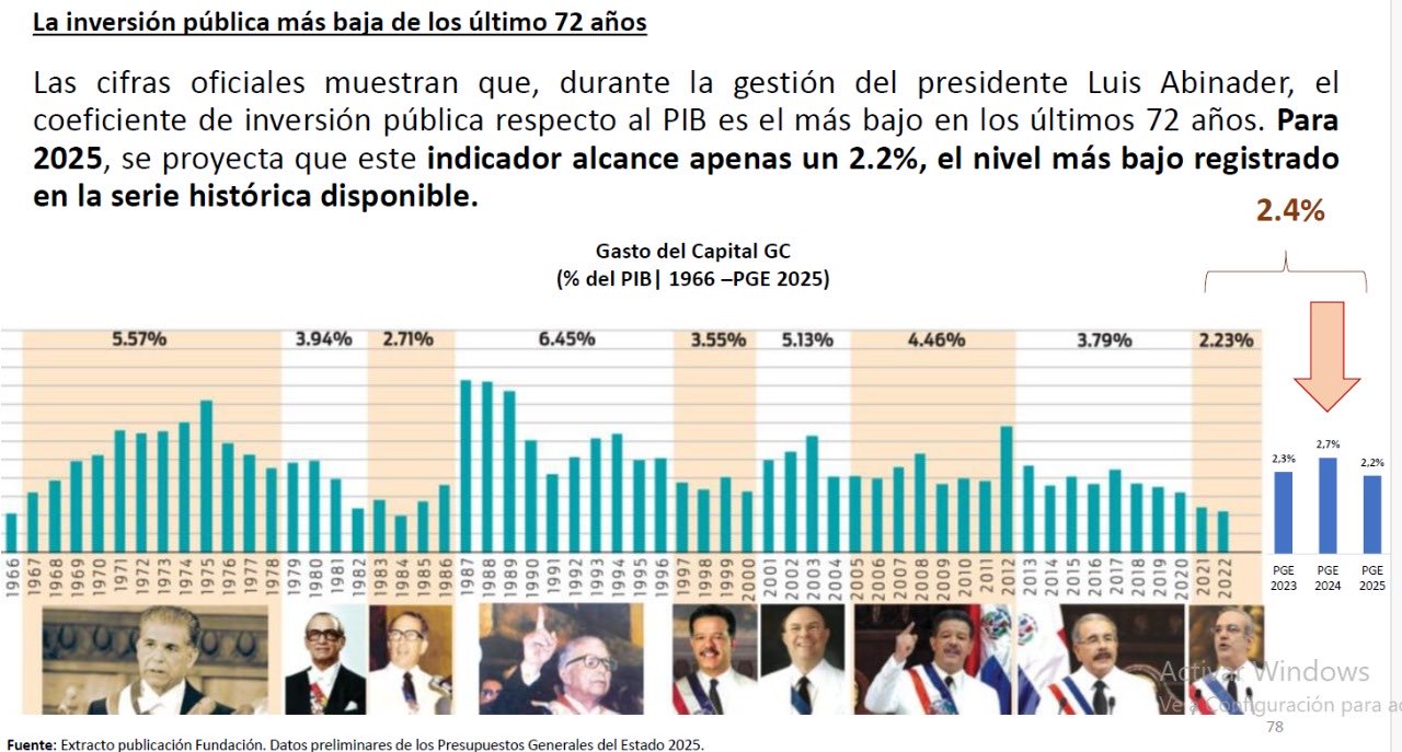 Luis Abinader con el PRM, formado con la mayoría de la dirigencia y simpatizantes que dejaron al PRD, presenta la más baja inversión pública de un gobernante en los últimos 57 años, de apenas 2.23% en un lustro, un periodo de 4 años y un año del presente.