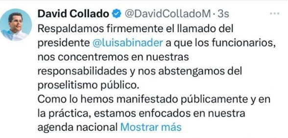 "Respaldamos firmemente el llamado del presidente Luis Abinader para que los funcionarios nos concentremos en nuestras responsabilidades y nos abstengamos del proselitismo político", agregó.