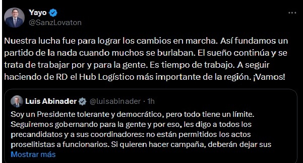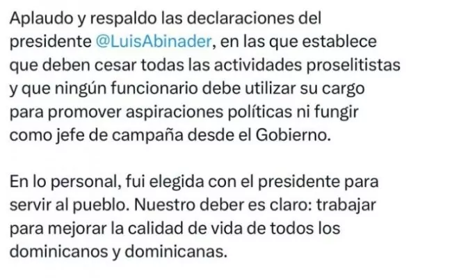 La vicepresidenta Raquel Peña expresó: "Aplaudo y respaldo las declaraciones del presidente @LuisAbinader, en las que establece que deben cesar todas las actividades proselitistas y que ningún funcionario debe utilizar su cargo para promover aspiraciones políticas ni fungir como jefe de campaña desde el Gobierno", escribió la vicepresidenta.