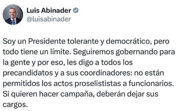 "Les digo a todos los precandidatos y a sus coordinadores: los actos proselitistas dirigidos a funcionarios no están permitidos", indicó Abinader en un mensaje publicado en sus redes sociales.