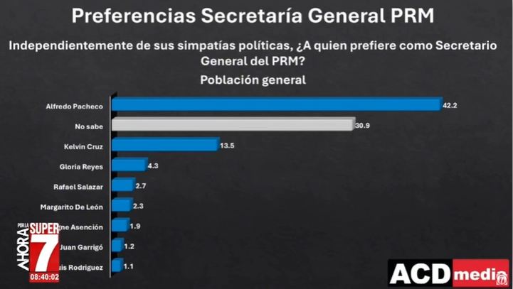 Santo Domingo, RD.- Alfredo Pacheco, actual presidente de la Cámara de Diputados, se perfila como el favorito para asumir la Secretaría General del Partido Revolucionario Moderno (PRM), según una reciente encuesta realizada por ACD Media.