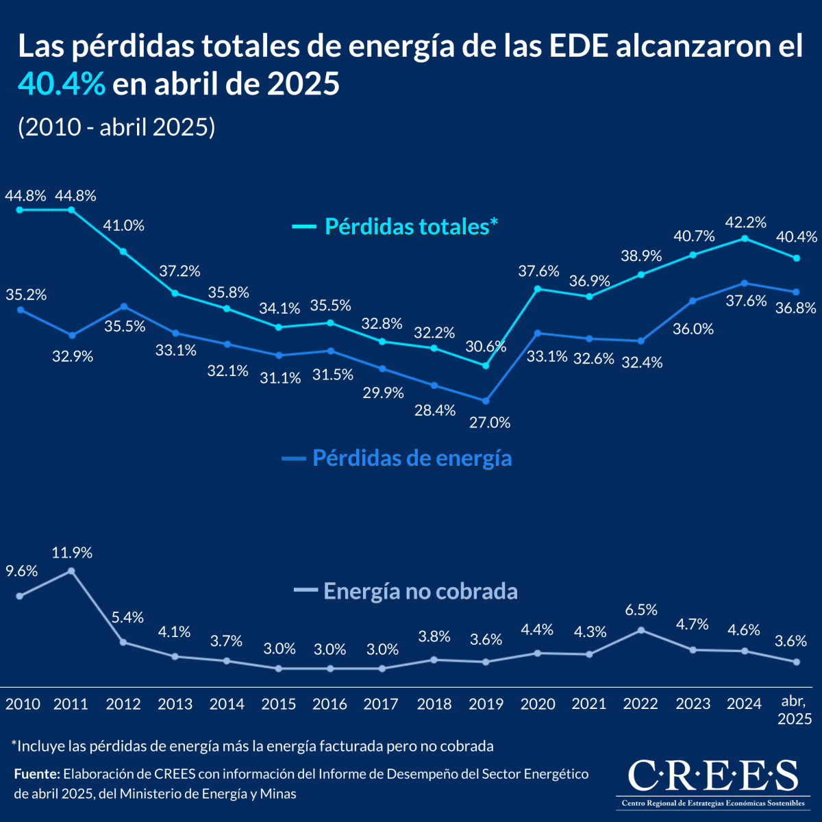 En términos absolutos, las EDE compraron 6,126.2 GWh durante ese período. De esa cantidad, 2,252 GWh no se facturaron, lo que representa pérdidas del 36.8% del total adquirido. A esta cifra se añade un 3.6% correspondiente a energía que fue facturada pero no cobrada lo que da como resultado el 40.4% de pérdidas totales hasta abril de 2025.