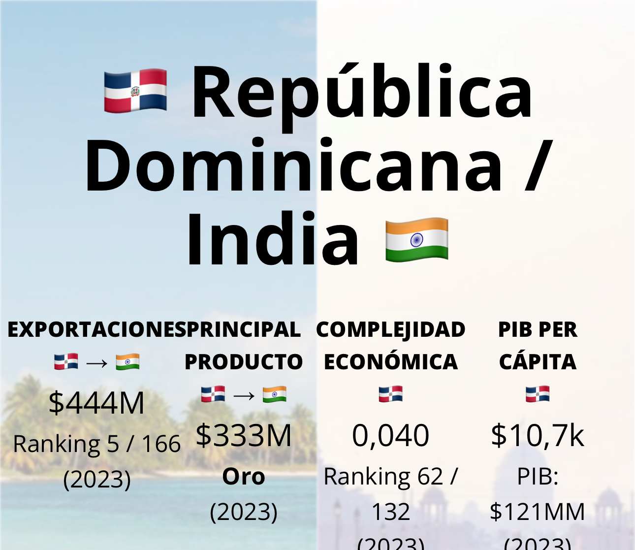 De acuerdo a estadísticas del Observatorio de Complejidad Económica (OEC por sus siglas en inglés) en mayo 2025, la República Dominicana exportó $197 millones de dólares a la India e importó e $33 millones, lo que dio como resultado un balance comercial positivo de $164 millones.