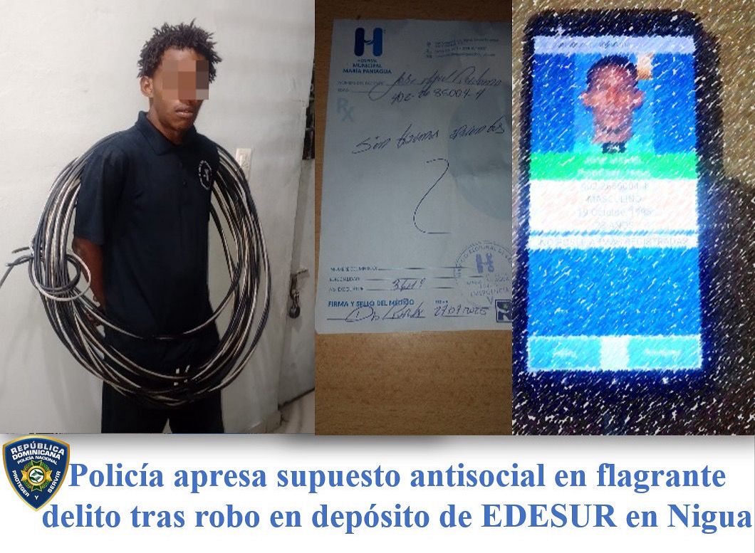 El arresto se produjo durante labores rutinarias de patrullaje en la zona industrial de Nigua, luego de que el individuo fuera sorprendido momentos después de haber penetrado de manera ilegal al depósito de la empresa EDESUR, ubicado en la comunidad antes mencionada, sin autorización alguna. El detenido logró sustraer un rollo de alambre industrial.