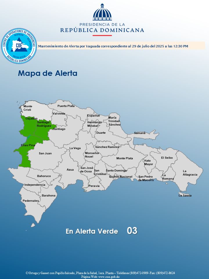 Santo Domingo, R.D. – La Dirección del Centro de Operaciones de Emergencias (COE) informó este lunes que mantiene el nivel de alerta verde para las provincias Santiago Rodríguez, Dajabón y Elías Piña, debido a posibles crecidas de ríos, arroyos y cañadas, así como inundaciones urbanas y repentinas.