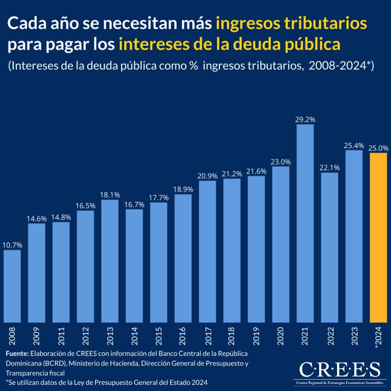 Santo Domingo. – De cada 100 pesos que el Estado dominicano espera recaudar en impuestos en 2025, casi 29 se destinarán únicamente al pago de intereses de la deuda pública, sin que esto reduzca ni un centavo del capital adeudado.