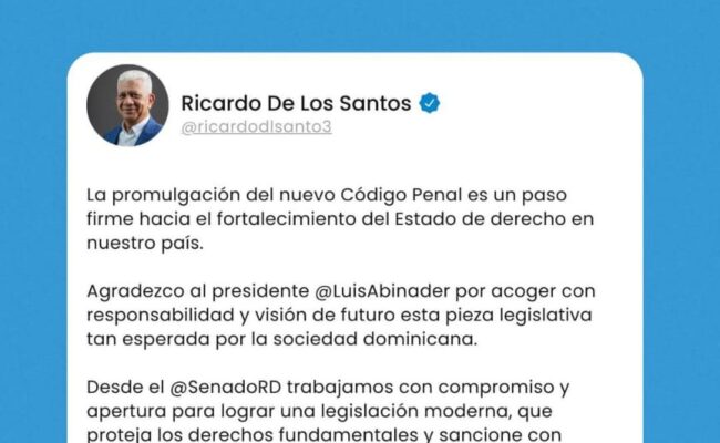 Por su parte, el presidente del Senado, Ricardo de los Santos, anunció su respaldo a la promulgación del nuevo código.