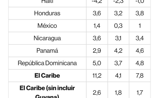 El estudio de la CEPAL destaca que en el Caribe (excluyendo a Guyana) se proyecta un crecimiento del 1,8% en 2025 y del 1,7% en 2026, lo que representa una desaceleración respecto a 2024. Esto se explica por el menor crecimiento del PIB de los Estados Unidos y la consecuente reducción de la demanda de servicios turísticos, además de la disminución de la demanda global de servicios.