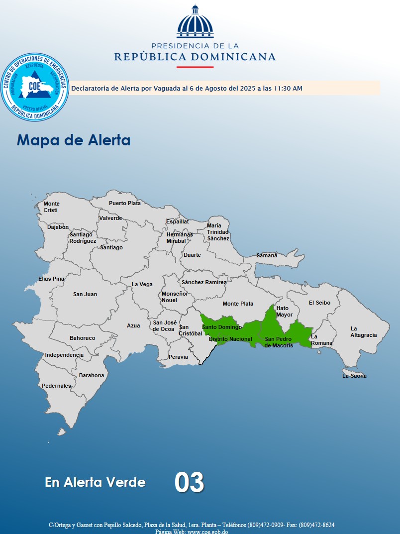 Con base en lo establecido en el artículo 2, capítulo 1, de la Ley 147-02 sobre Gestión de Riesgos, el COE ha declarado alerta verde para las siguientes demarcaciones: