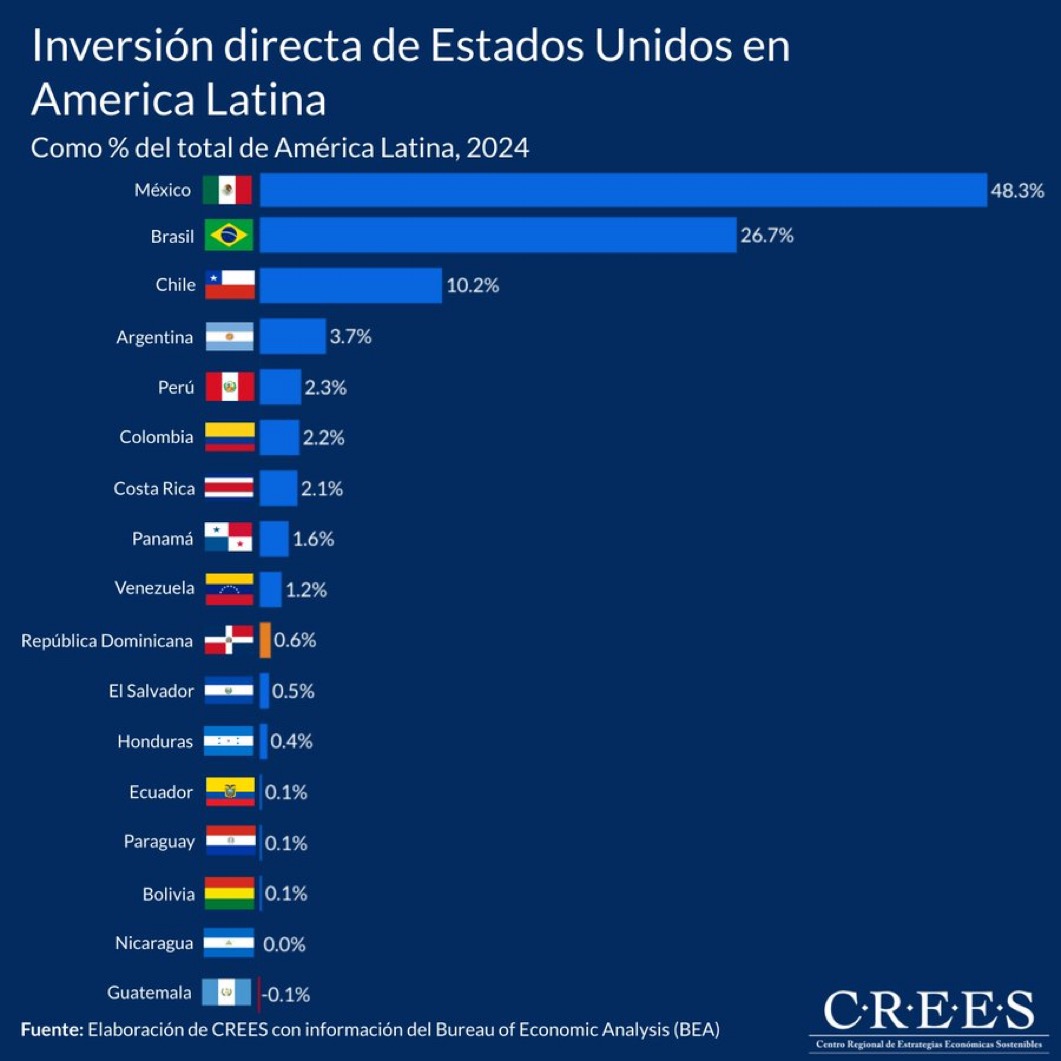 Según estadísticas del BEA a 2024, la República Dominicana recibe solo el 0.6% de la inversión directa de EE. UU. en Latinoamérica, situándose en el décimo lugar entre 17 destinos de la región.