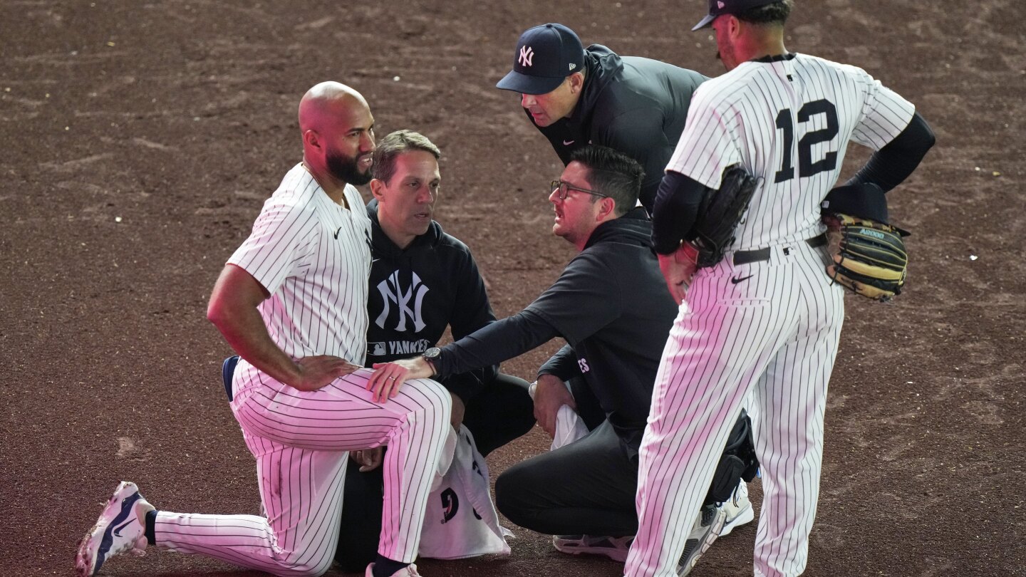Rosario corrió hacia atrás por la pelota, chocó contra la cerca y cayó hacia atrás mientras el jardinero central Trent Grisham retrocedía y lanzaba la pelota al campocorto Anthony Volpe para el out forzado en segunda base.