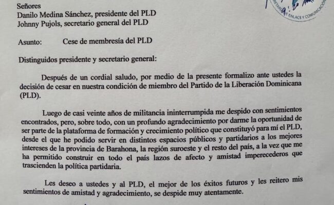 Después de un cordial saludo, por medio de la presente formalizo ante ustedes mi decisión de cesar mi condición de miembro del Partido de la Liberación Dominicana.
