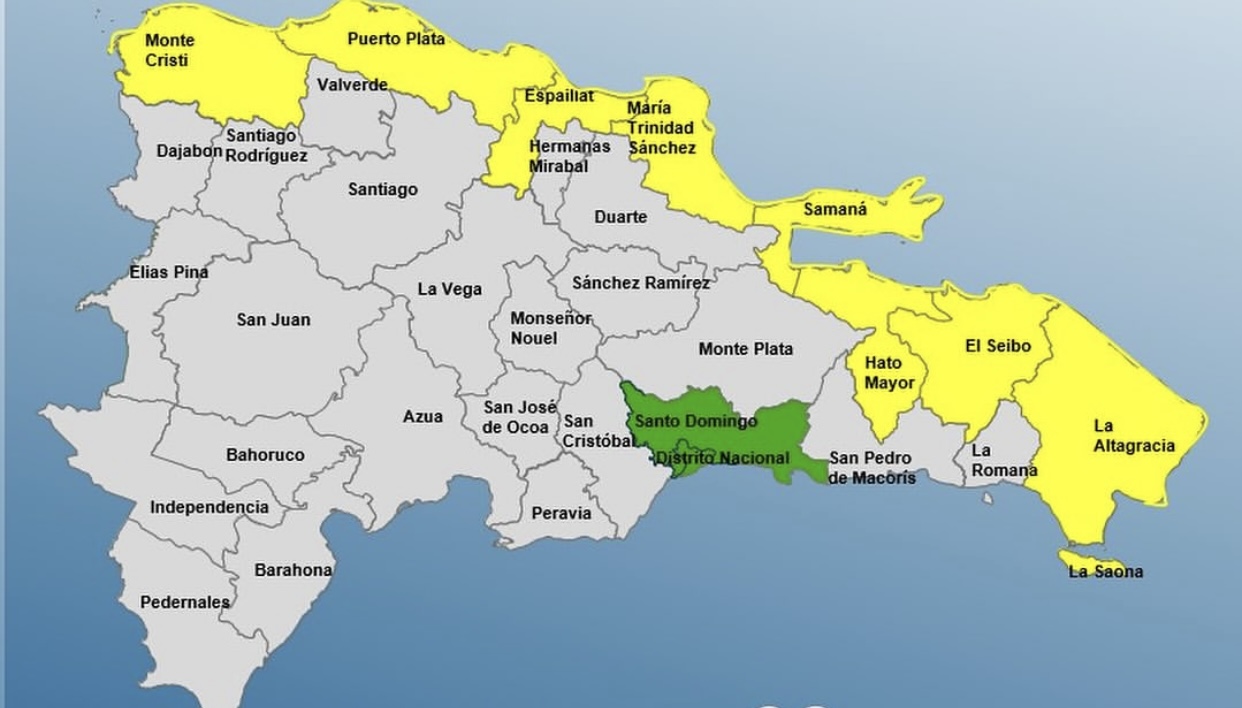 Las provincias en alerta amarilla son: La Altagracia, Hato Mayor, María Trinidad Sánchez, Montecristi, El Seibo, Samaná, Espaillat y Puerto Plata. Mientras que Santo Domingo y el Distrito Nacional permanecen en verde.