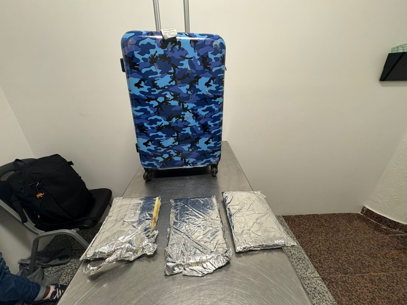 Al abrir la maleta, se descubrió un doble fondo donde se encontraron tres láminas, presumiblemente de cocaína, envueltas en papel lumínico, con un peso aproximado de 2.3 kilogramos.