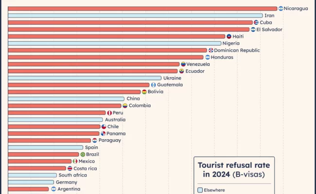 Factores como la relación política con Estados Unidos y la confianza de las autoridades en que el visitante regresará a su país influyen directamente en la tasa de rechazo. Por ejemplo, Uruguay, un país pequeño y estable, presenta tasas de rechazo incluso inferiores a las de naciones desarrolladas como Francia y Japón.