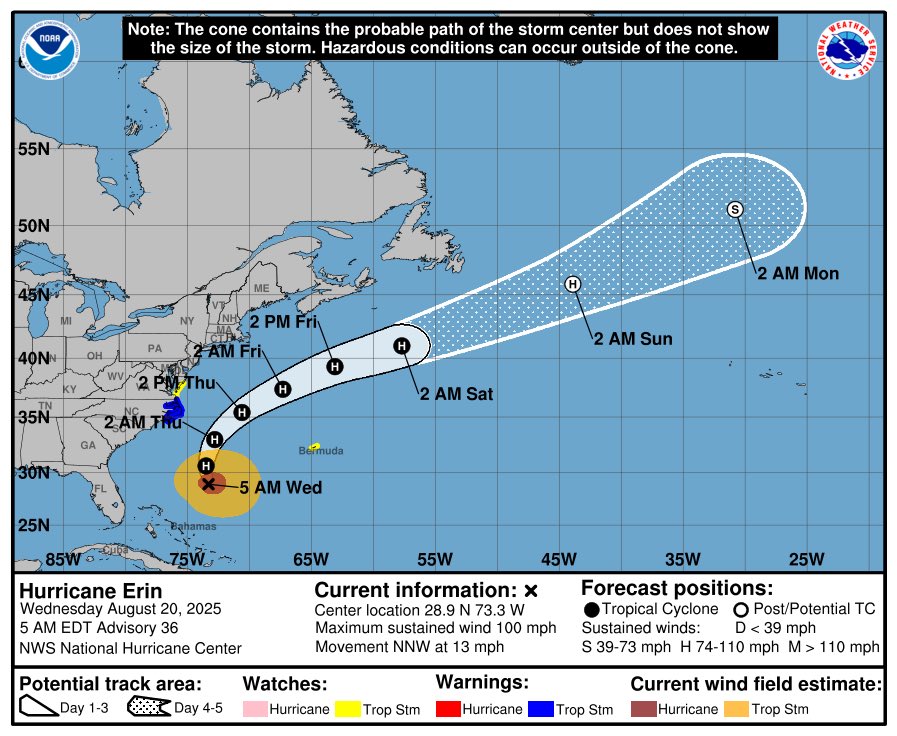 La agencia federal con sede en Miami subrayó que Erin, un huracán de categoría 2 en la escala Saffir-Simpson de un total de 5, las playas de casi toda la costa este de Estados Unidos registrarán condiciones extremadamente peligrosas, con oleaje fuerte y corrientes de resaca que amenazan la vida de bañistas y surfistas.
