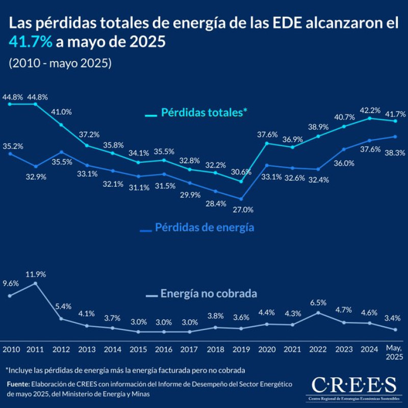 Santo Domingo. – Las Empresas Distribuidoras de Electricidad (EDE) perdieron el 41.7 % de la energía adquirida en los primeros cinco meses de 2025.