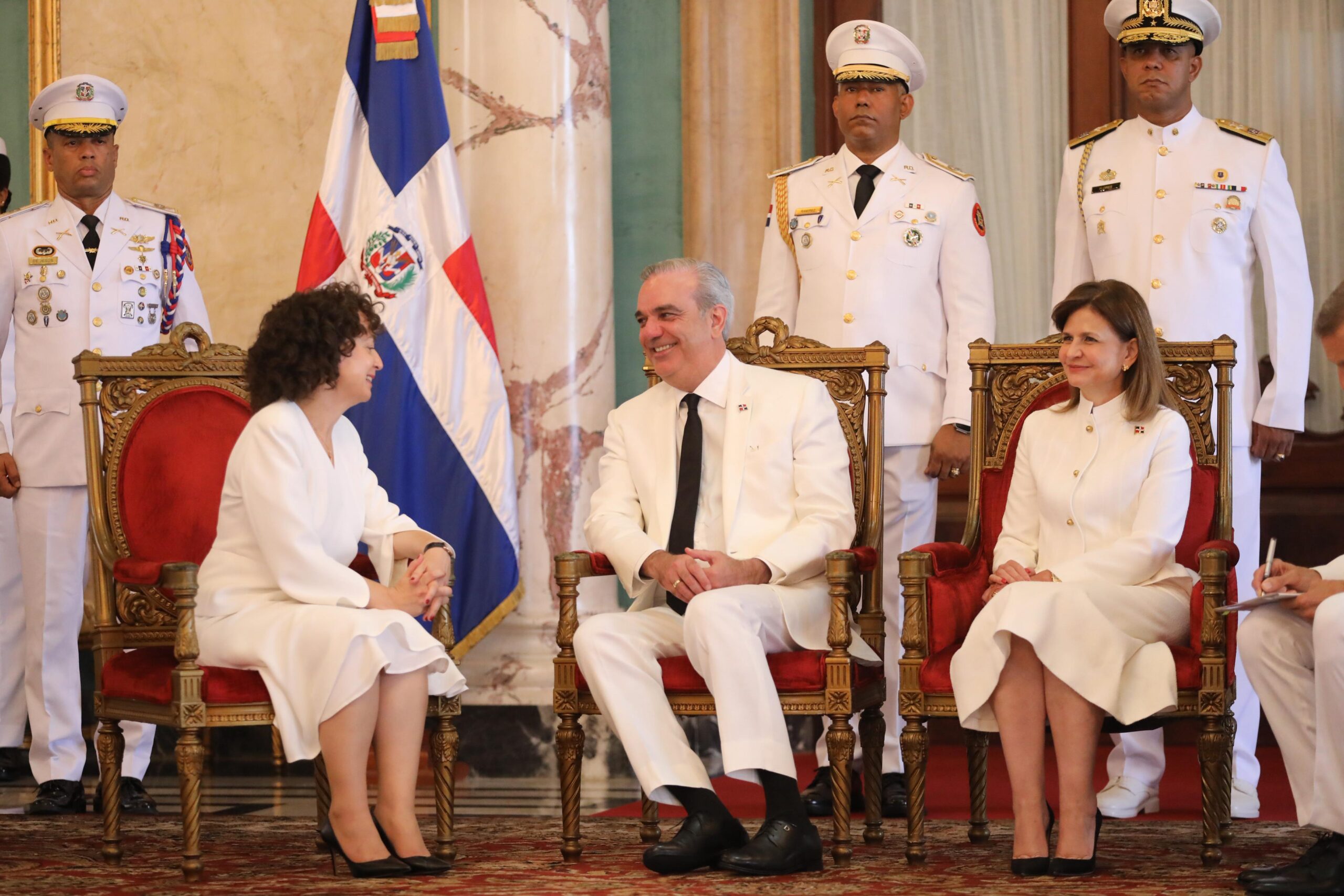 En el acto de entrega, el mandatario, junto con la vicepresidenta Raquel Peña y el ministro de Relaciones Exteriores, Roberto Álvarez, dio la bienvenida a los diplomáticos que presentaron sus credenciales ante el Estado dominicano.