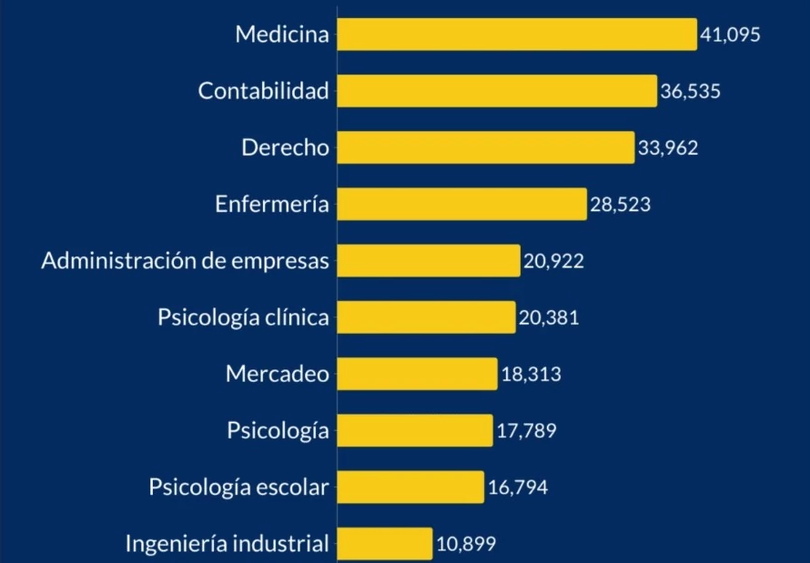 Según los datos más recientes del Ministerio de Educación Superior, Ciencia y Tecnología (MESCYT), en 2024 la carrera con el mayor número de matriculados fue Medicina, con 41,095 estudiantes. En segundo lugar se ubica Contabilidad, con 36,535 estudiantes, y luego Derecho, con 33,962 estudiantes.