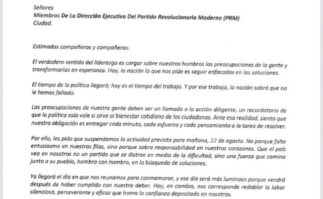 Abinader aclaró que la decisión no responde a falta de entusiasmo en las filas del partido, sino a un ejercicio de compromiso con el país. “Les pido que suspendamos la actividad prevista para mañana 22 de agosto. No porque falte entusiasmo en nuestras filas, sino porque sobra responsabilidad en nuestros corazones. Que el país vea en nosotros no un partido que se distrae en medio de la dificultad, sino una fuerza que camina junto a su pueblo, hombro con hombro, en la búsqueda de soluciones”, puntualizó.