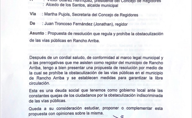 Rancho Arriba, San José de Ocoa. — El regidor Jonathan Troncoso depositó formalmente ante la Secretaría del Concejo de Regidores de Rancho Arriba un proyecto de resolución municipal orientado a prohibir la obstaculización de las vías públicas en el municipio, con el propósito de garantizar el libre tránsito, la seguridad vial y la adecuada utilización de los espacios comunes.