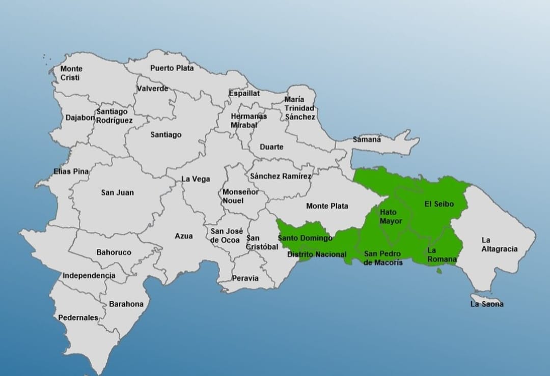 Las zonas en alerta son: Santo Domingo, San Pedro de Macorís, El Seibo, La Romana, Hato Mayor y el Distrito Nacional.