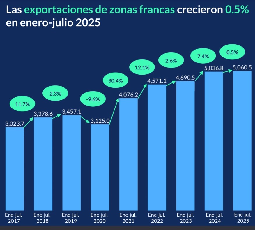 Así lo especifica el Centro Regional de Estrategias Económicas Sostenibles (CREES) en un análisis titulado: “Exportaciones de zonas francas crecieron solo 0.5 % de enero a julio de 2025”.