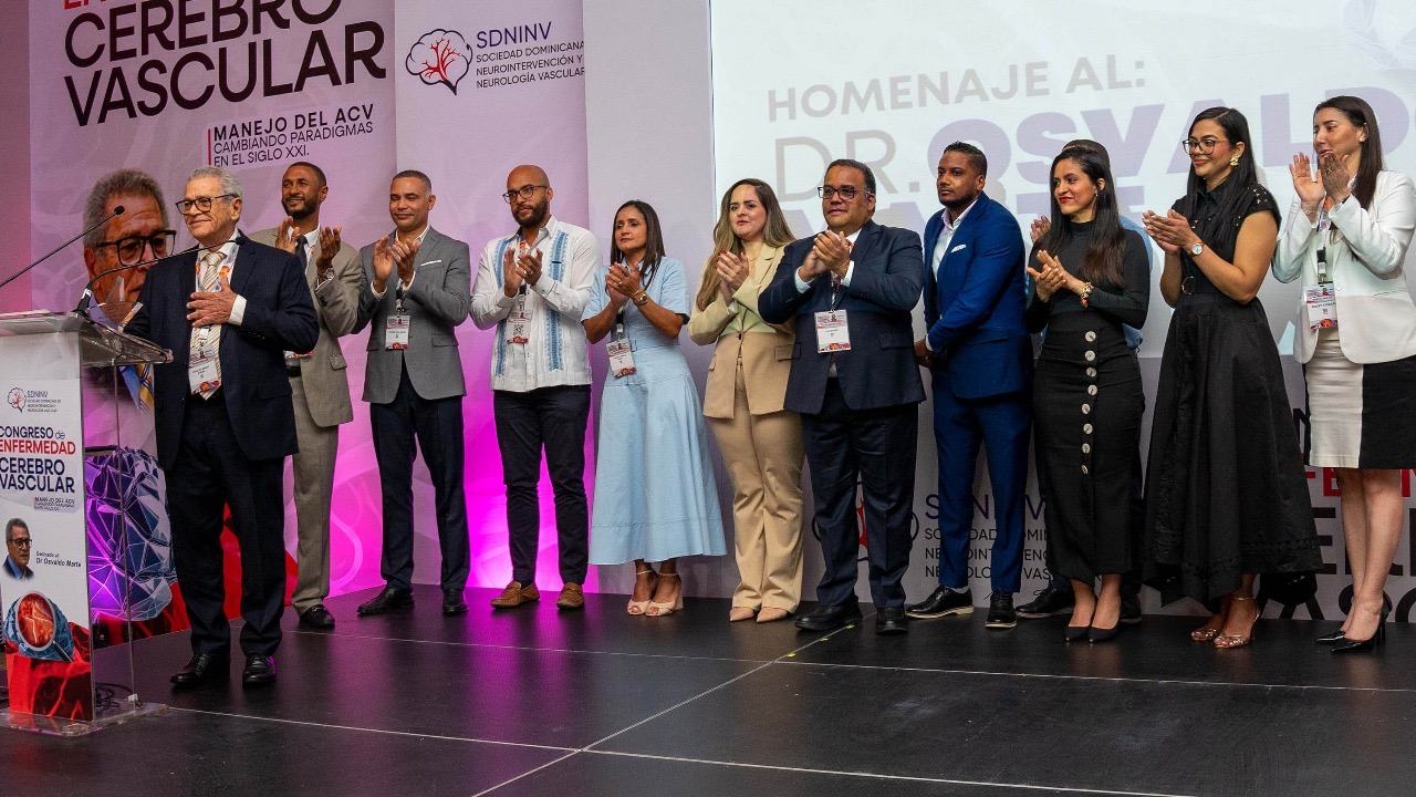 En un momento de gran emotividad, los asistentes rindieron homenaje al doctor Osvaldo Marté Durán, pionero de la neurocirugía en el país, cuya trayectoria fue reconocida como base de la escuela dominicana de neurointervención.